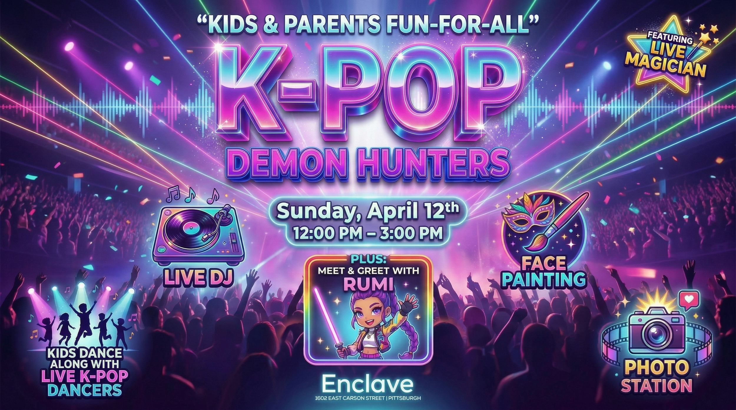 Join us for K-Pop Demon Hunters: Kids & Parents Fun-For-All — a high-energy family event packed with live DJs, K-pop dancers, face painting, a photo booth, and a magical meet-and-greet with Rumi! Happening Sunday, April 12th from 12–3 PM at Enclave, Pittsburgh — don’t miss the fun!
