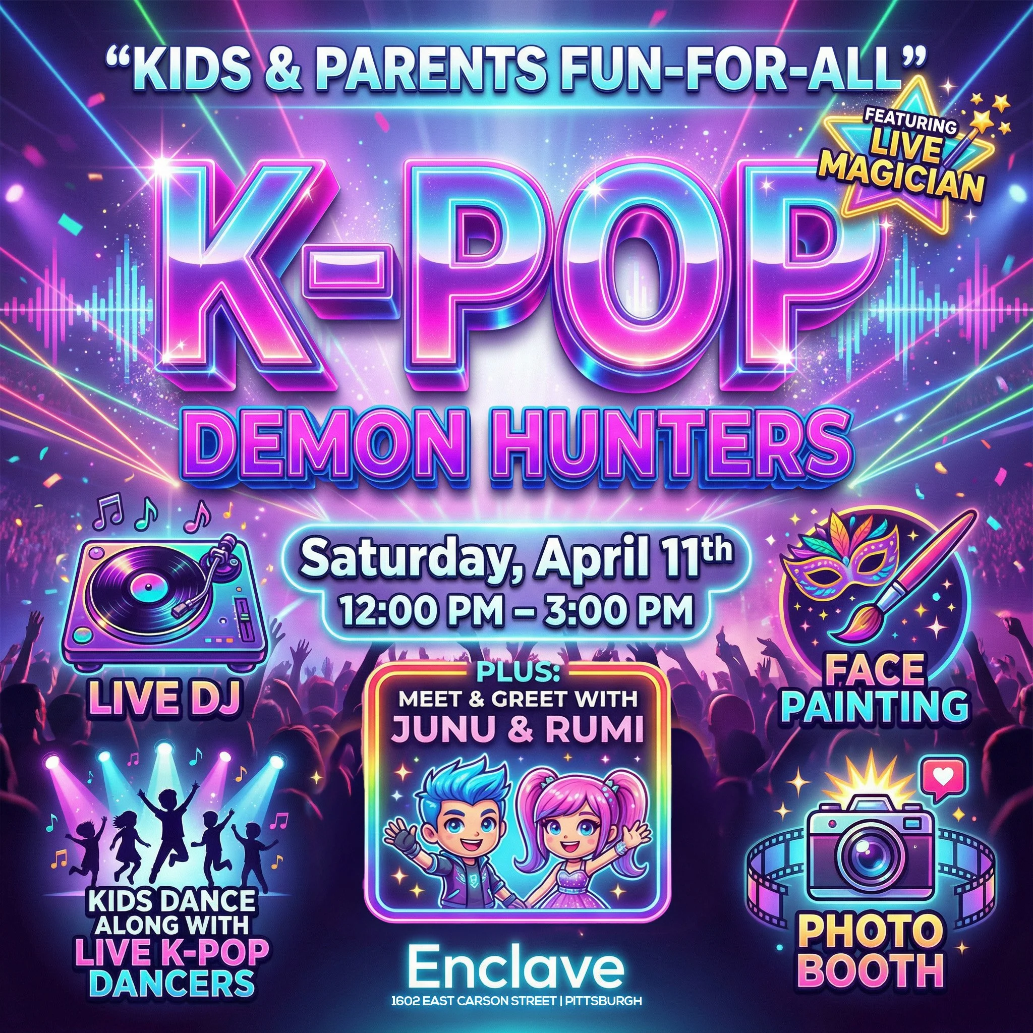 Join us for K-Pop Demon Hunters: Kids & Parents Fun-For-All — a high-energy family event packed with live DJs, K-pop dancers, face painting, a photo booth, and a magical meet-and-greet with Junu & Rumi! Happening Saturday, April 11th from 12–3 PM at Enclave, Pittsburgh — don’t miss the fun!